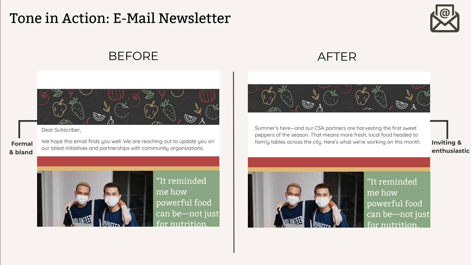 Revised real-world examples (social, email, website) for on-brand clarity