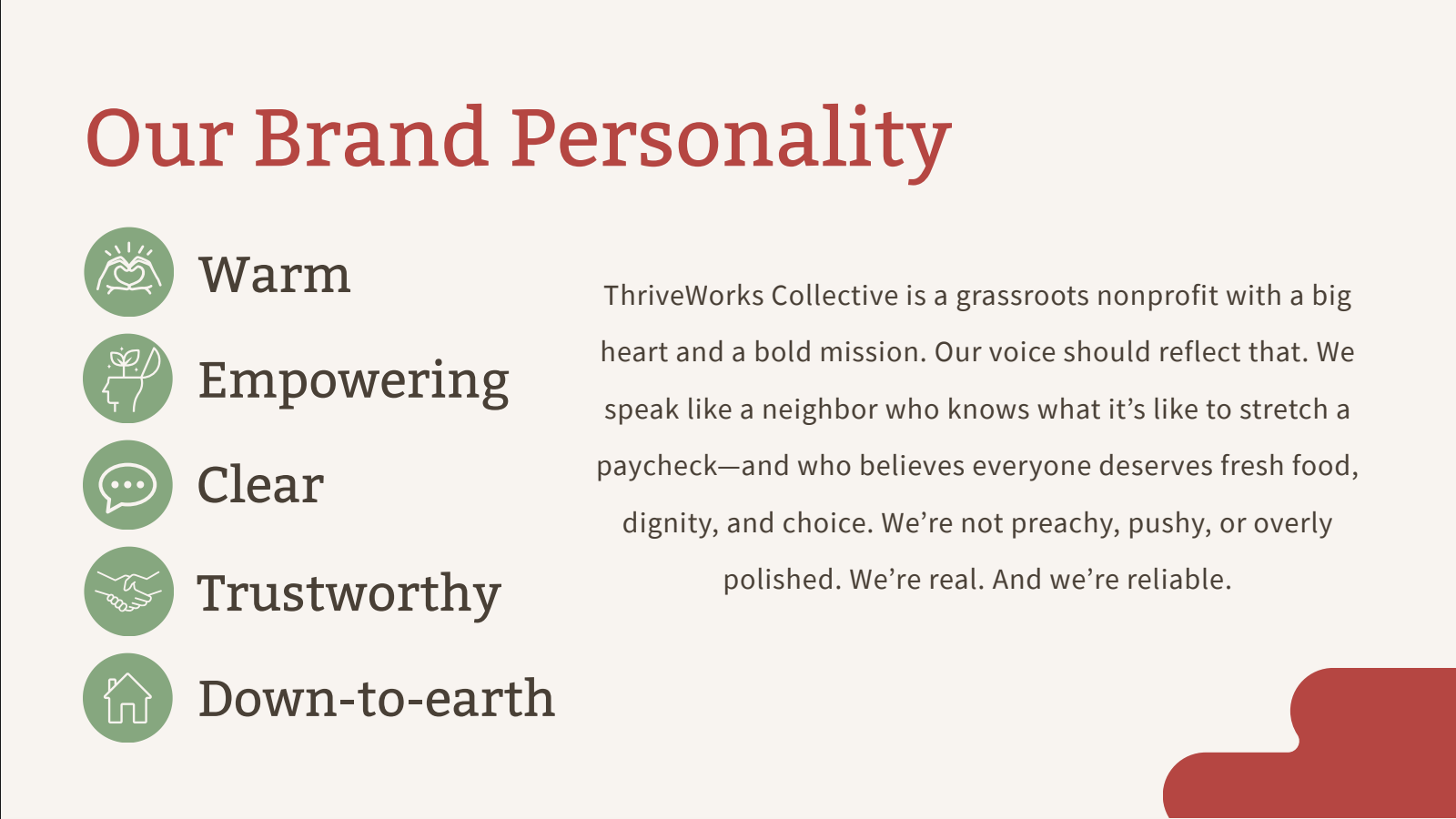 To help ThriveWorks Collective build a consistent and credible digital presence, I created a brand voice guide that defines the organization’s tone, language, and messaging across platforms.