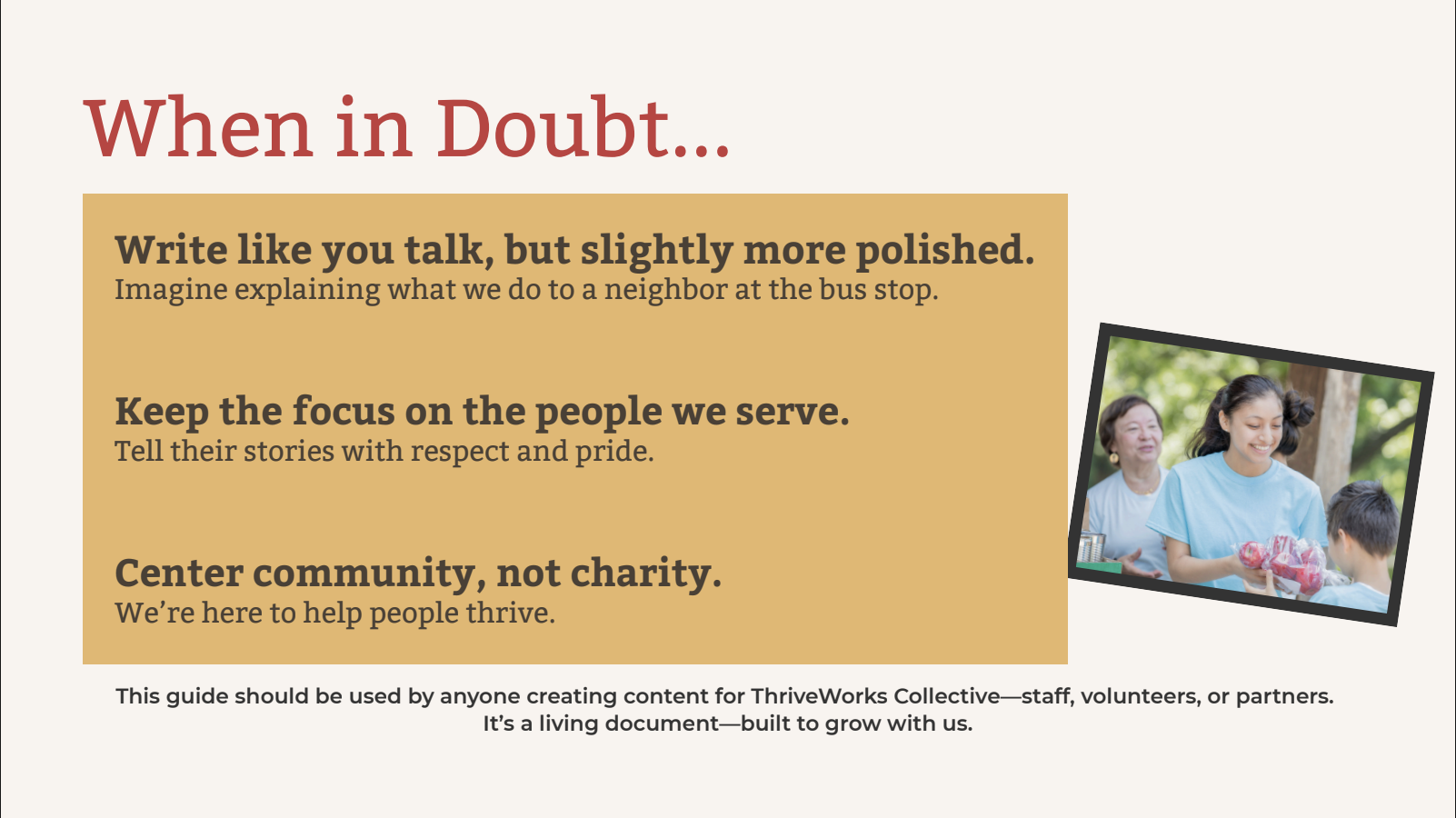 The voice framework reflects ThriveWorks’ mission of dignity, empowerment, and access, ensuring all communication resonates with both the communities they serve and the funders who support them.